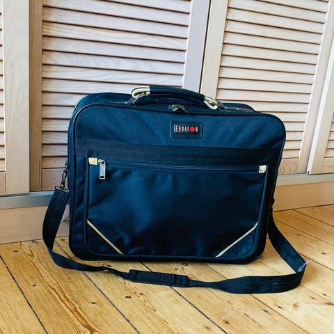 Flot vintagekuffert i stof og kunstlæder med 2 hjul - med små slidmærker i bunden ved hjul.