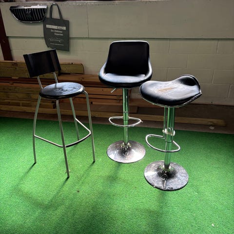 To barstole med rundt sæde polstret i gråt stof. Benene er lavet af lyst træ og har en sort metalfodstøtte for ekstra stabilitet. Designet til at blive brugt som siddeplads ved høje borde eller barer. Købt for 1000 kroner i Ivla i alt for fire år siden (kvittering haves). Er i rigtig god stand. Sælges samlet for i alt 375 kr.