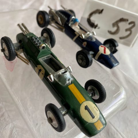 Blå u/nr. Surtees T.S.9 F.1. Corgi Toys – Whizz Weels. No Pat.Apr. 3396/69. Made in GT Britain. Trade Mark. Scale: Ikke anført. L= cirka 12 cm. Tændstikæsken er cirka 6 cm x 3,5 cm. Bemærk: Mangler vindskjold. Maling / lakering: Original. Pletmalet: Nej. Omlakeret: Nej. Stand: Se Note.