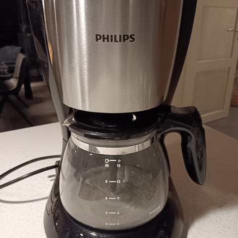 Philips kaffemaskine med kande i glas og sort håndtag. Rustfrit stål og sort plastmateriale. Velegnet til brygning af kaffe til flere kopper.