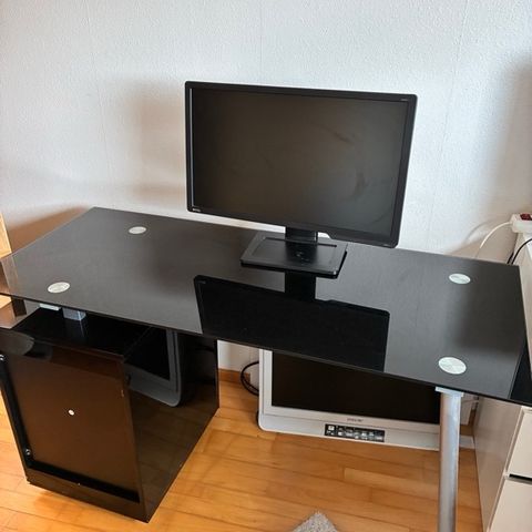 Lækkert designer skrivebord med massiv glasplade og teaktræs ben. Højden kan justeres