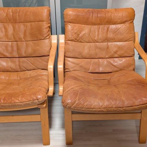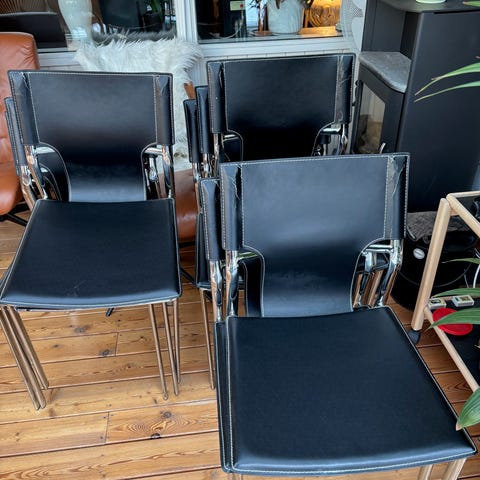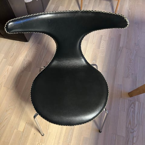 Brun læderstol med armlæn og metalben. Stolen har en rund form med polstret sæde og ryg i cognacfarvet kunstlæder, hvilket giver god komfort. Benene er lavet af metal og har en sort finish. Stolen kan anvendes som spise- eller kontorstol. Købt i Ilva for fire år siden for 1000 kroner (kvittering haves).
