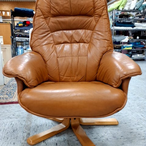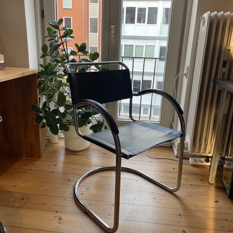 Brun læderstol med armlæn og metalben