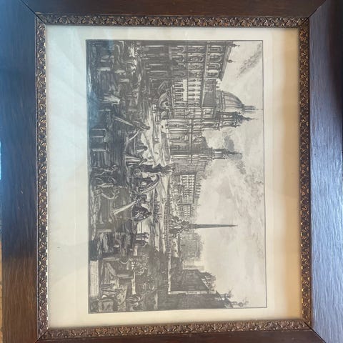 Kobberstik, Giovanni Batista Piranesi, 35,5 x 58,5 cm., 2. halvdel af 1700- tallet, originalt tryk fra tiden, udsigt mod Engelsborg i Rom, med broen over Tiberen og Peterskirken i baggrunden, , sign. i trykket.