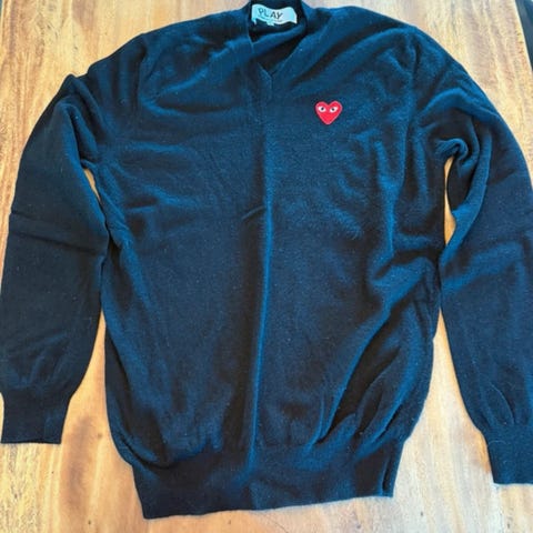 Comme des Garçons Sort Cardigan i størrelse L til mænd. Cardiganen har knapper foran og er fremstillet i et blødt materiale. Den har et karakteristisk rødt hjerte-logo på brystet.