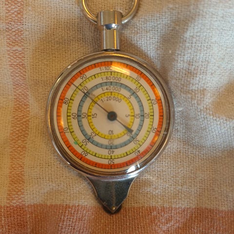 Kortmåler, opsiometer, curvimeter. Anvendes til at måle distancer på et kort med følgende målestoksforhold: 1:20.000, 1:25.000, 1:40.000, 1:50.000, 1:75.000, 1:80.000, 1:100.000, 1:200.000.