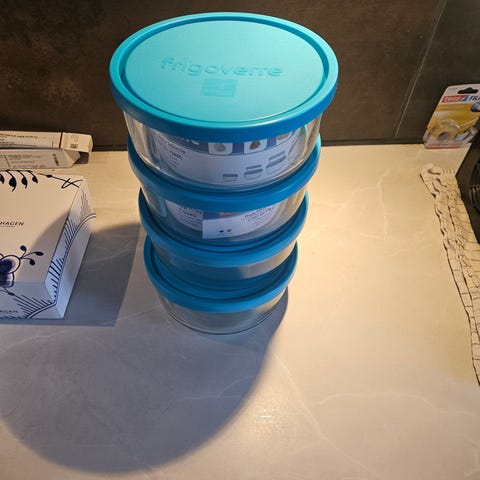Skåle/opvevaringssæt i porcelæn med hvid og blå farve. Sættet består af tre skål med et låg, som kan stables og med håndtag. Velegnet til servering og opbevaring af mad. Ukendt mærke. Aldrig brugt. 18 i diameter og 8 i dybde. Kan afhentes