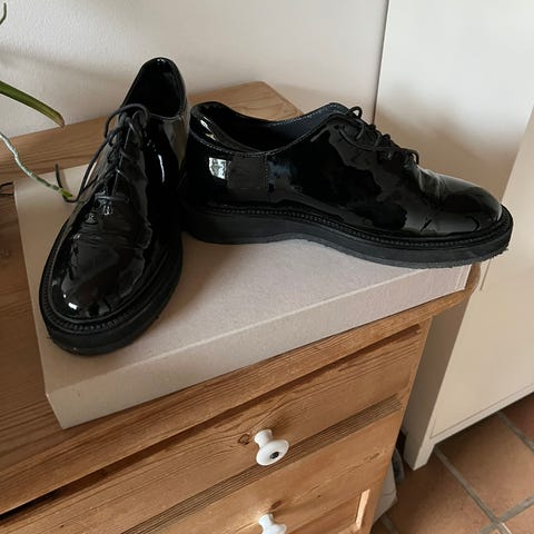 Angulus Festsko i størrelse 39 til damer. Skoene er sorte med lakfinish og har en blokhæl. Materialet er laklæder, og skoene har en rem over vristen med spænde.
