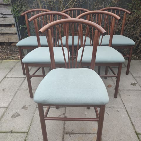 6 stk brugte spisebordsstole i kirsebærtræ og stolesædet monteret med stof i påfugle mønster. stole har Alm brugsspor, dog har stole stået i direkte sollys og er derfor falmet i farven. B:51cm. D:41cm. H:79cm. SH:46cm. Stole er ikke nye og sælges derfor som brugte, derfor kan der forekomme ridser, slid og skrammer. Prisen er kun 2.500kr.