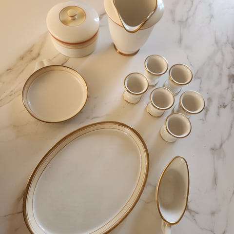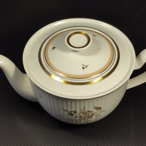 Smukt og sjældent Royal Copenhagen Clarissa stel, dekoration 5950 med guldkant og fuglemotiv.
