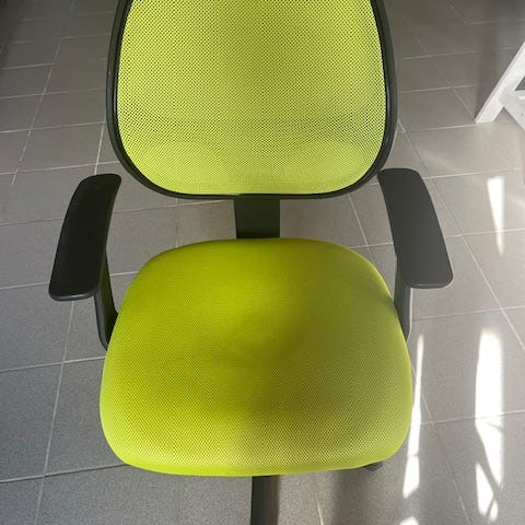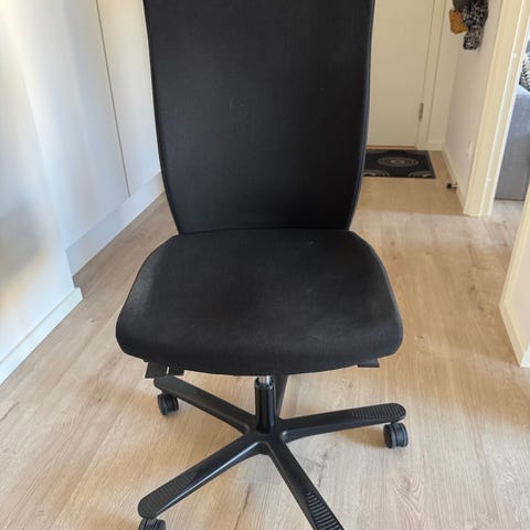 Kontorstol med sort polstret sæde og metalstel. Drejelig funktion og fodstøtte i metal. Justerbar højde og rund sædeform.