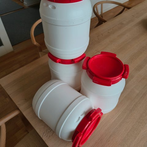 Hemtex opbevaringsbeholdere. Beregnet til vaskepulver, hvorfor der også følger to doseringsskeer med, men kan bruges til opbevaring af andre ting også.