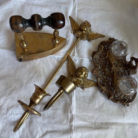 #vintage #retro #genbrug #paentgammelt #fund #loppe #loppefund #glas #vase #lågkrukke #ravfarvet #gammelrosa #fejeblad #messing #dekoration #interieur #indretning #boligindretning