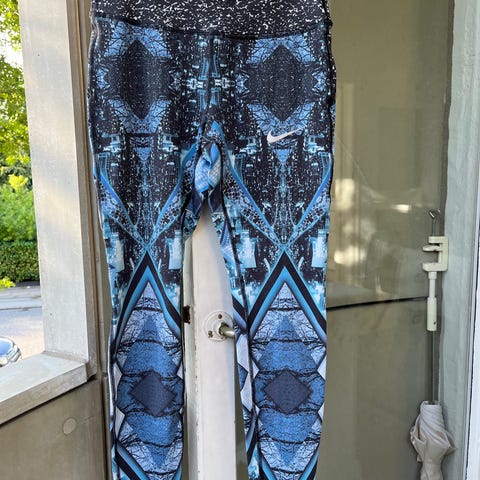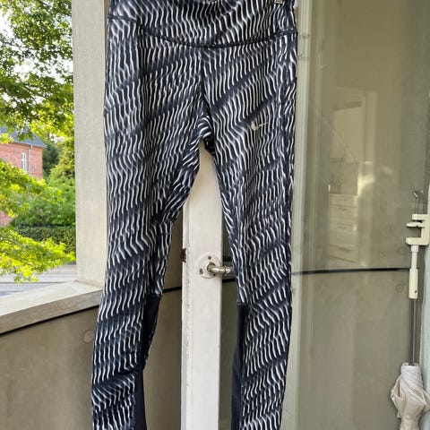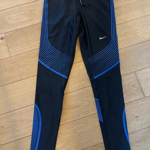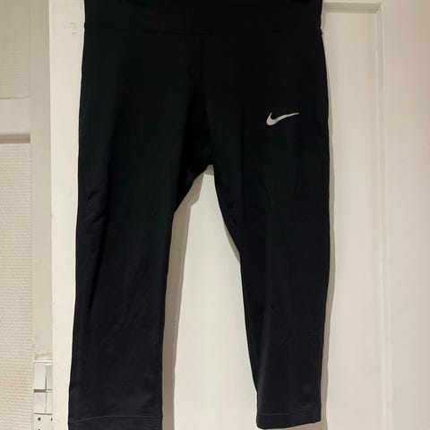Nike Dri-FIT løbetights til kvinder i størrelse M. Tightsene er sorte og fremstillet i et materiale, der inkluderer polyester og elastan, designet til at transportere sved væk fra kroppen under løb. De har justerbar snøre i taljen og en lynlåsdetalje ved anklerne.