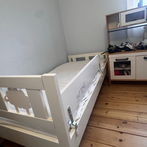 Velholdt juniorseng som kan bruges med og uden sengehest. Senge har lidt brugsspor som ses på billed 4.