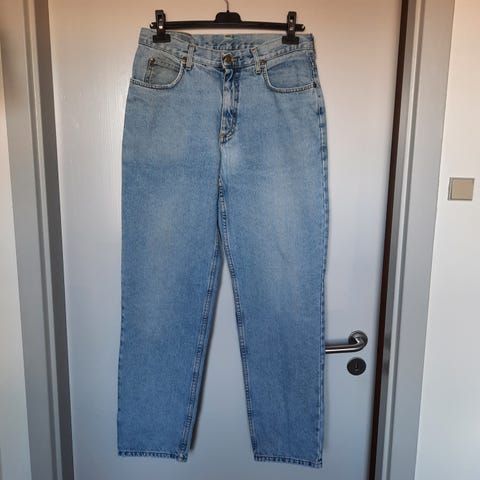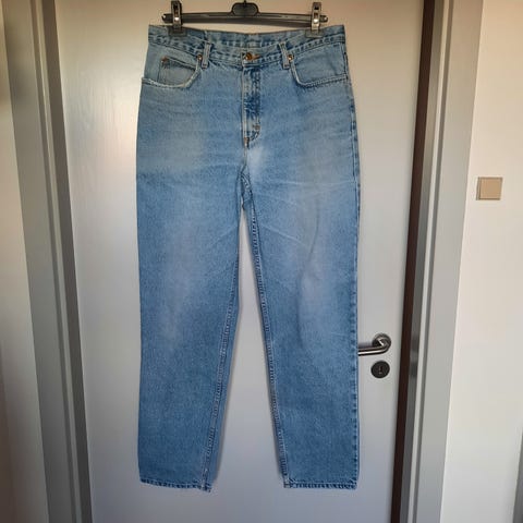 Cowboybukser Lee Riders. Champ fra 80érne i blå farve til kvinder, størrelse 34 - 32. Fremstillet af 100% bomuld. Klassisk design med front- og baglomme. Materialet er velegnet til daglig brug og har en tidløs denimstil.