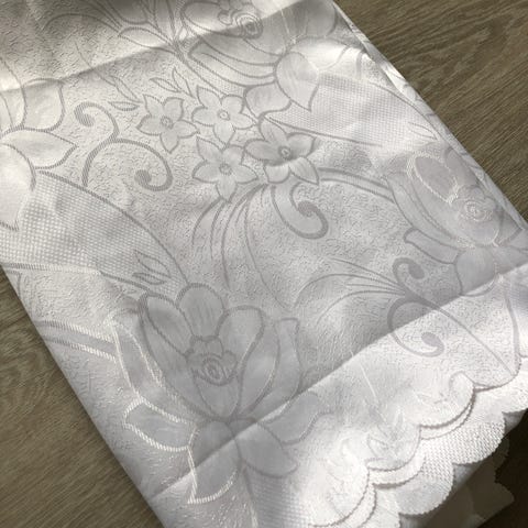 Hvid dug i plastik med smukt blondemønster - aldrig brugt og i original emballage. Kan bruges både som dug og under anden dug.