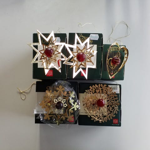 Både ornament og original æske er i velholdt og hel stand. Ornamentet kan pudses for mere sølvfarvet look.