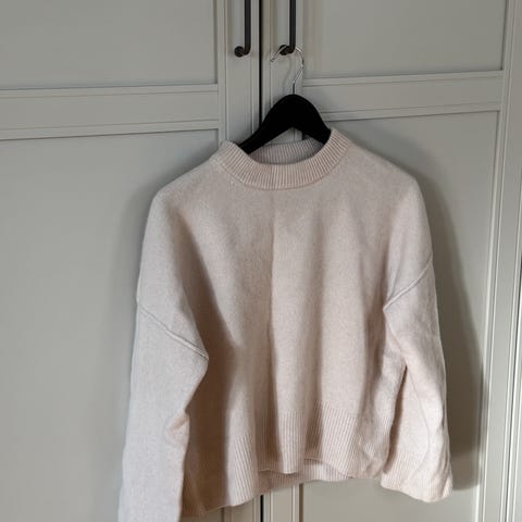 Trøje i cashmereblanding fra H&M Premium. Beige str. XL. Forholdsvis lang og tætsiddende trøje i blød finstrikket kvalitet af uld- og kashmirblanding. Lav skuldersøm og ekstra lange ærmer med hul til tommelfinger. 90% uld, 10% cashmere. Dejlig varm. Aldrig brugt og stadig med tags. Nypris kr. 550.