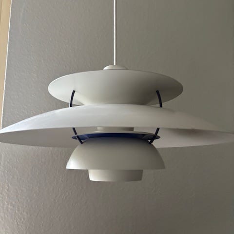 Den røde PH5 er en af Danmarks mest ikoniske pendler, designet af Poul Henningsen for Louis Poulsen i 1958. Lampen er skabt til at give blændfrit lys via de flere koncentriske skærme, som fordeler lyset blødt og behageligt. Den har desuden en trumpetformet reflektor, der giver et varmt nedadrettet lys.