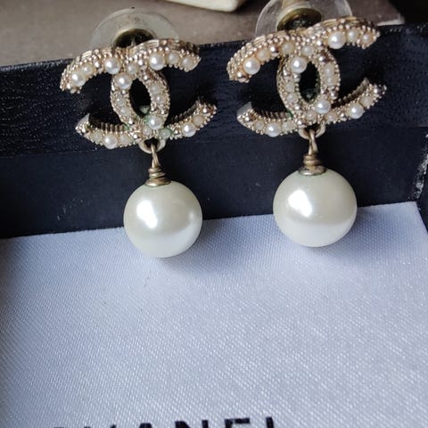 Chanel Øreclips i forgyldt metal med perle og simili sten. Måler 2,5 cm i diameter.