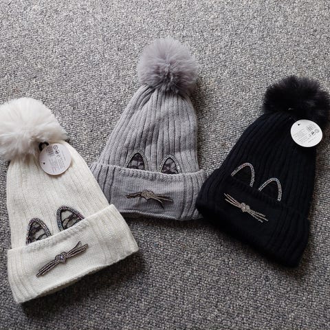 Perket 1-3 år Fin og varm strikhue i rosa farve, pyntet med små perler og blød pompon på toppen. Med øreklapper og bindebånd, så den sidder godt på de koldeste dage.