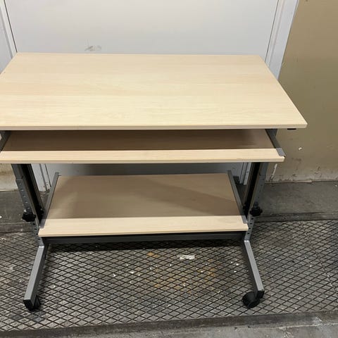 Skrivebord med en overflade i træfinish og hvide metalben. Bordet har en skuffe til opbevaring under bordpladen. Designet til brug som arbejds- eller skrivebord i hjemmet eller kontormiljøer.