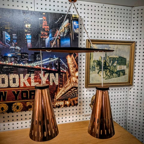 4 stk. Teak og solid kobber. Design Winding & Wright, produceret ved Kemp and Lauritzen i 1960 erne. Diameter: 17 cm og højde: 28 cm. Generelt i god stand, men 2 af dem har brændmærker nederst på teak delen.