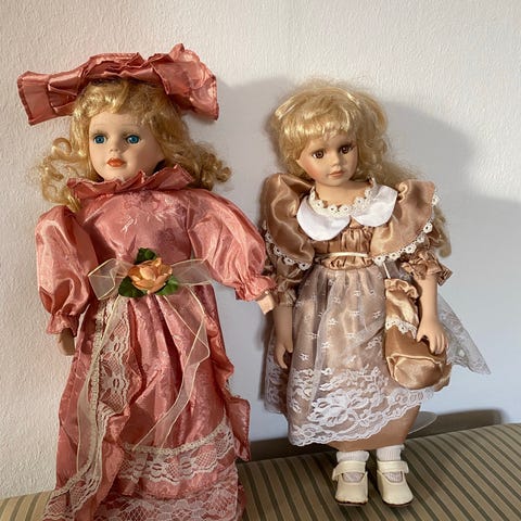 Samling af vintage porcelænsdukker med detaljerede kjoler