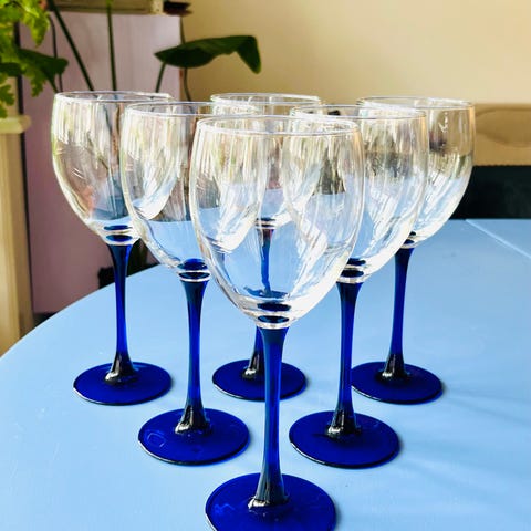 Luminarc hvidvinsglas med mørkeblå fod. 18,5 cm høje.