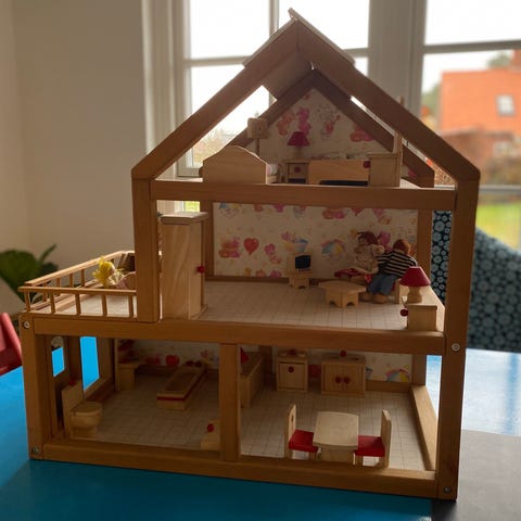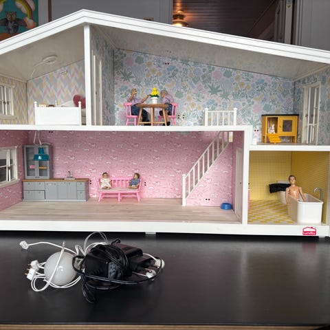 Dukkehus med møbler og andet tilbehør. Synlige brugsspor nogle steder, men ellers god stand.