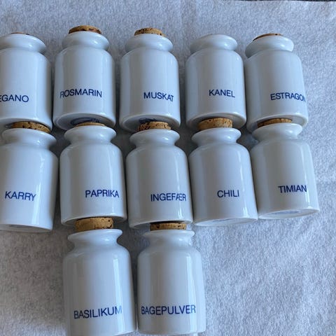 Eva-Trio krydderiglas sæt i hvid keramik med prop i kork. Sættet indeholder flere små krukker til opbevaring af forskellige krydderier. Designet til praktisk opbevaring i køkkenet. Sælges samlet for 40 kr.