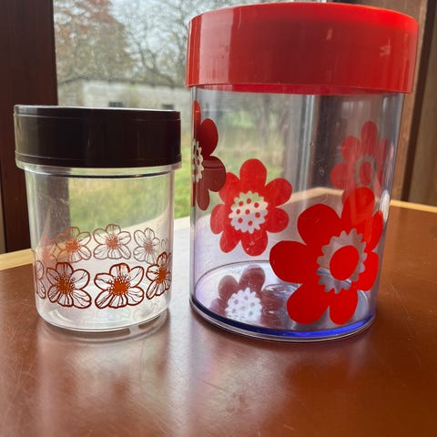 1 stor, 2 små Erik Kold plastbøtter/dåser (rød og brun) i pæn stand + en hvid (uden Kold stempel i bunden) hvor blomster og skrift delvist er slidt af. Samlet pris 100 kr.