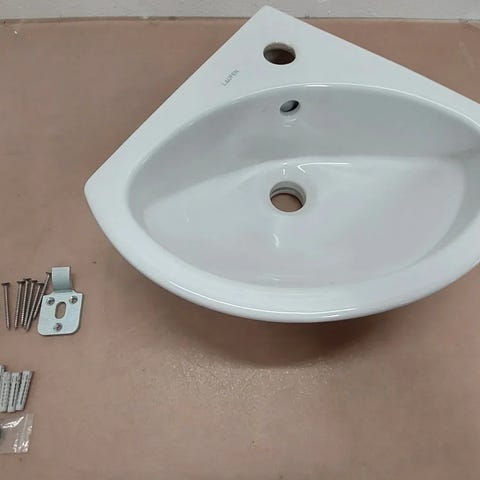 Axa Corner Normal hjørne håndvask i porcelæn, hvid farve. Designet til montering i hjørner, hvilket sparer plads i badeværelset. Fremstillet af holdbart porcelæn med glat overflade for nem rengøring. Velegnet til mindre rum eller områder med begrænset plads