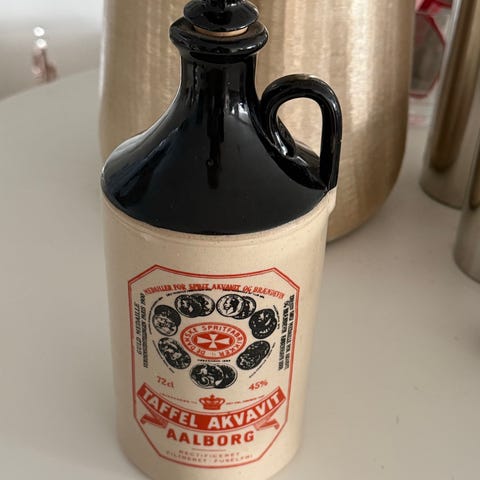 En lampe lavet af Aalborg Akvavit lerflaske med skærm hvorpå der står skål på mange sprog