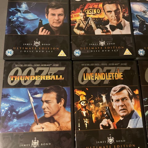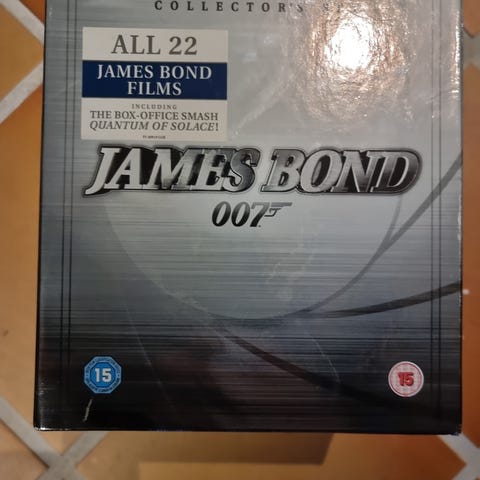 James Bond DVD-samling bestående af 11 film med forskellige titler og udgaver. Inkluderer film som Casino Royale, Quantum of Solace, Die Another Day, GoldenEye, The World Is Not Enough, Tomorrow Never Dies, The Spy Who Loved Me, The Living Daylights, Licence to Kill, og Thunderball. DVD-format. 4 er stadig i folie samlet lot
