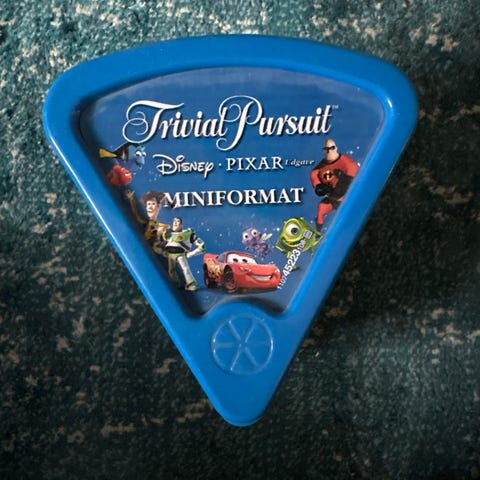 Trivial Pursuit Disney Pixar Miniformat spil i en trekantet blå plastikbeholder. Spillet indeholder spørgsmål relateret til Disney og Pixar film og er designet til underholdning for alle aldre.