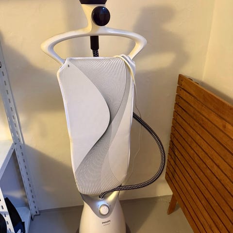 Philips GC514/40 dampstryger med hvid og lilla design. Produktet inkluderer en justerbar stang og en slange til dampudledning. Egnet til opfriskning og fjernelse af folder i tøj.