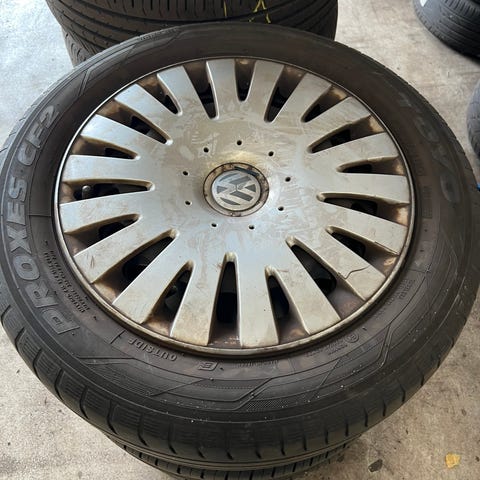 Originale VW-stålfælge. 5 x120 med originale VW-navkapsler. Passer på en VW t5 transporter. Der sidder fire næsten nye (uge 28 2023) Firestone Vanhawk 2 215x65xR16 sommerdæk på dem. To med 9mm mønster og to med 7,5mm tilbage. Kan eventuelt leveres. Bud modtages.