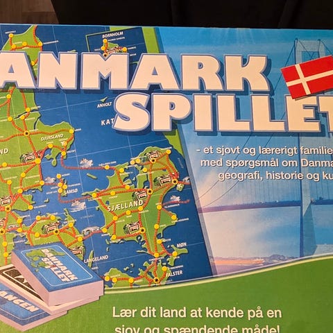 Danmark Spille brætspil med kort over Danmark. Spillet indeholder et illustreret kort over Danmark med forskellige postkortbilleder af kendte steder og monumenter. Materialet er pap og papir. Spillet er velegnet til brug i familie- og børneaktiviteter.