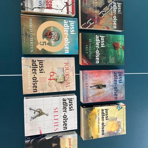Jussi Adler-Olsen Bøger Sæt med flere titler i forskellige udgaver og formater. Bøgerne er på dansk og inkluderer titler som 'Afdeling Q' serien. Sættet indeholder både hæfter og indbundne bøger med varierende omslag og design.