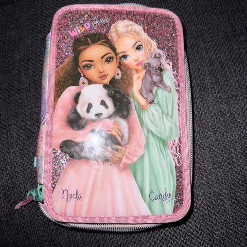 Top Model penalhus med glitrende lyserød yderside og motiv af en danserinde. Indeholder farveblyanter, lineal, viskelæder og blyantspidser. Velegnet til skolebrug eller kreativ tegning. Materiale og størrelse ikke specificeret.