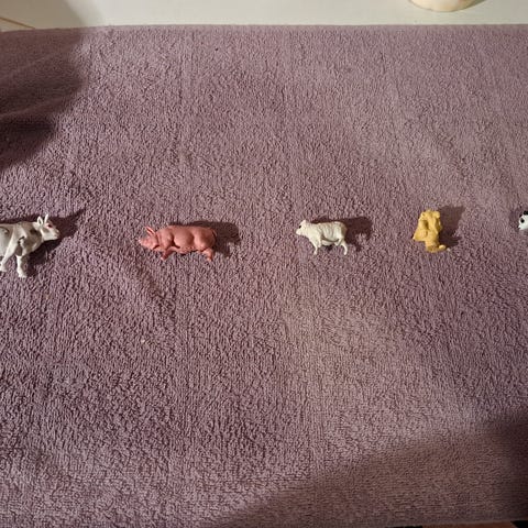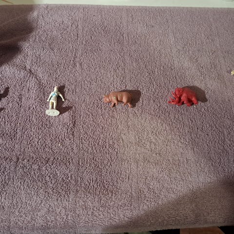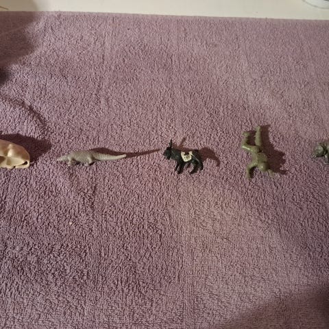 Sælger 5 ældre figurer: en lille gris, en lille grøn tiger, en stor mørk dinosaur, en riddermand og en arbejdende pige. Brugte men i fin stand. Sælges samlet.