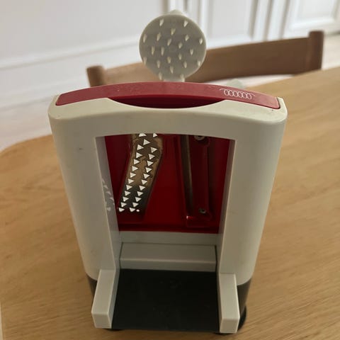 Gefu Spirelli pastaskærer i hvid og rød. Fremstillet i plastik og metal. Designet til at skære spiraler af grøntsager som pasta. Manuel betjening med håndsving. Kompakt størrelse til brug i køkkenet.