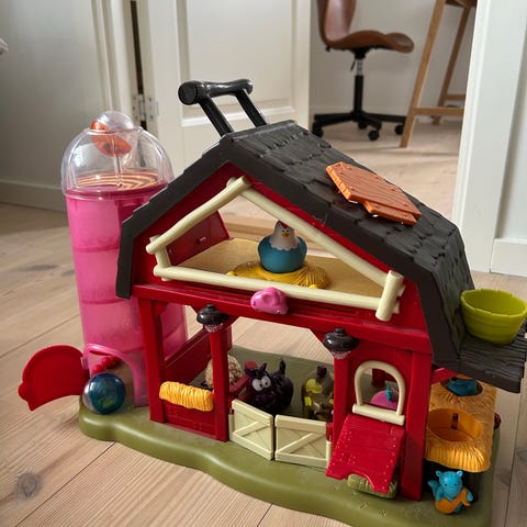 Stoftrykt bondegård designet af Jette Viby. Mange timers leg med bondegårdens dyr og mennesker, som kan placeres rundt omkring på aktivitetstæppet. Kan hænges på medfølgende rundstok på væggen. De mange figurer sættes fast med Velcro eller puttes i de små indsyede lommer. Ny pris 915kr