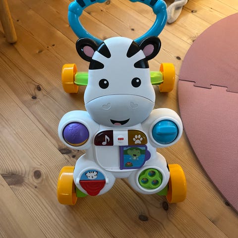 Sjov Fisher-Price gåvogn i hvid med farverige detaljer.