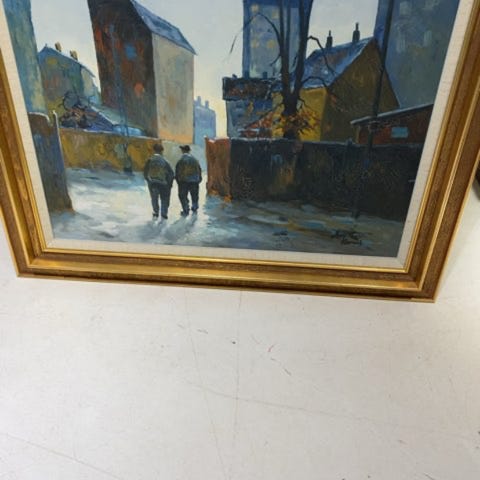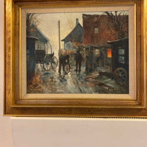Maleri - gammel nedslidt bondegård - personer i gang med at arbejde ,Afhentes i:,Røde Kors Virum (173),Bemærk at mail, chat og beskeder ikke besvares, og varen skal købes på knappen "Gå til varen"