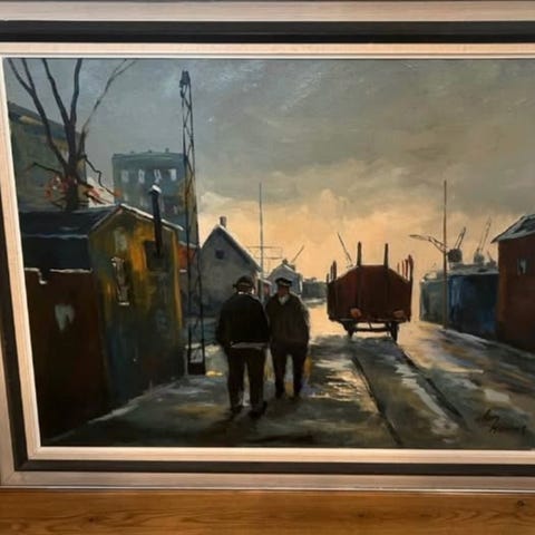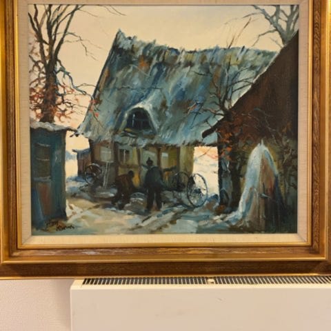 Billedet viser en maleri i en gylden ramme. Oliemaleri . Landsbybillede fra gamle dage . ,Afhentes i:,Røde Kors Virum (173),Bemærk at mail, chat og beskeder ikke besvares, og varen skal købes på knappen "Gå til varen"