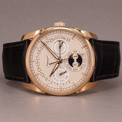 Skiven viser tid, lille sekund, dato, dag, måned, månefase og chronograph-funktion med 30-minutterstæller – alt sammen drevet af det automatiske Calibre 759, som har kolonnehjul, vertikal kobling og cirka 65 timers gangreserve.