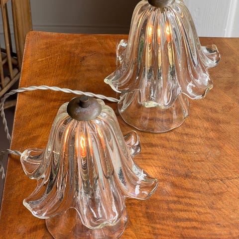 Beautiful vintage table lamp in clear Murano blow glass with brass details. Made in Italy in the 1930/40s. H21 x W17 x D11 cm Comes with ivory cotton braided wire with switchFew signs of age, but excellent vintage condition and intact.